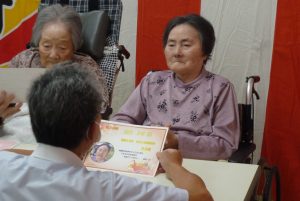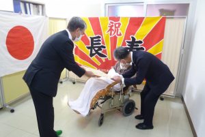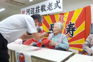 100歳になられる方には内閣総理大臣より祝い状と銀杯が、99歳になられた方には秋田市長より祝い状と記念品が、そして、102歳になられた方、施設に入所されてから5年が経過した方々とご利用者の皆様全員に河辺ふくし会より記念品が贈られました。
